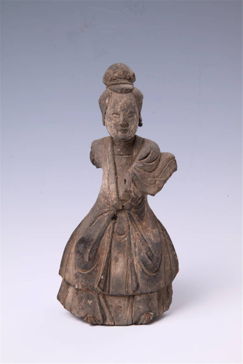 南宋木雕神女像,木雕,女神,呈坐姿,缺座,头盘高髻,宝相端庄,身着长衣长裙,腰束带,两手一前一后,圆雕,神态逼真。